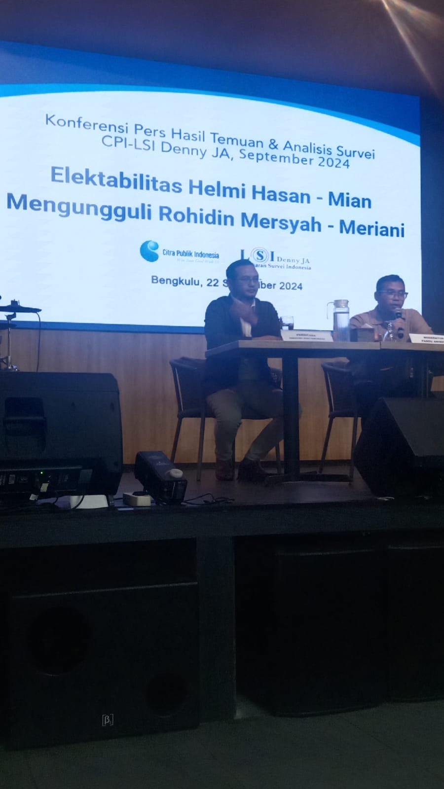 infosumatera.com – Hasil Survei Lingkaran Survei Indonesia (LSI) Denny J.A dari 8 -13 September di Bengkulu Elektabilitas Pasangan Helmi-Mian menembus angka 41,6 %.