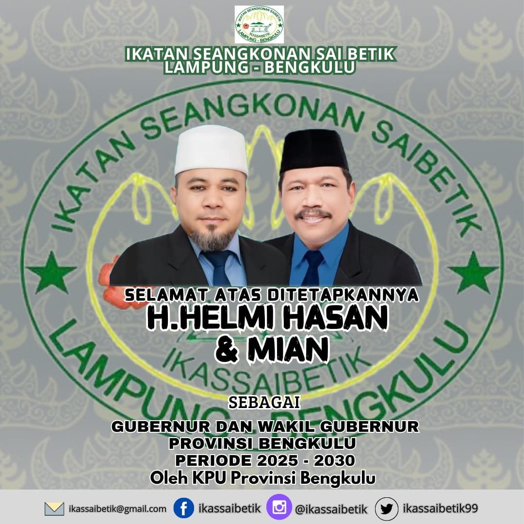 infosumatera.com-Ikatan Seangkonan Sai Betik (IKASSAIBETIK) Lampung-Bengkulu menyampaikan ucapan selamat atas penetapan H. Helmi Hasan SE dan Ir. H. Mian sebagai Gubernur dan Wakil Gubernur Bengkulu periode 2025-2030 oleh Komisi Pemilihan Umum (KPU) Provinsi Bengkulu.