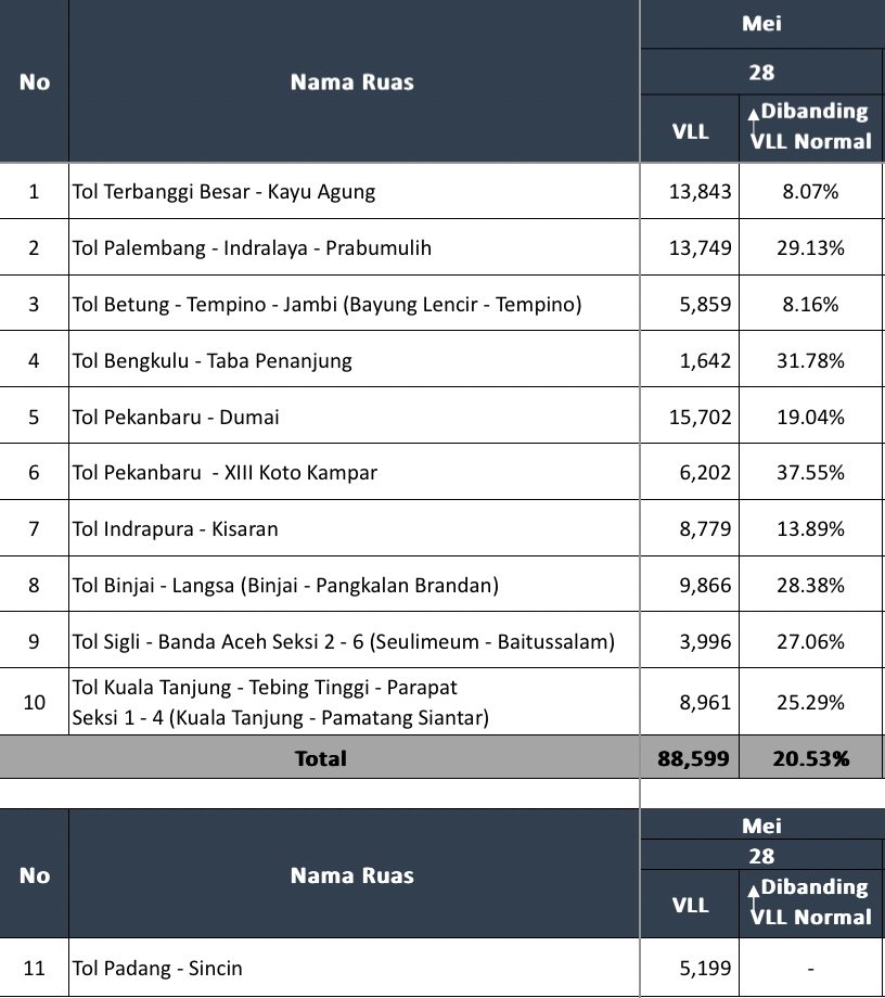 ‘Rincian jumlah kendaraan di masing-masing ruas tol dapat dilihat pada tabel di atas, ujar dia melalui siaran rilis