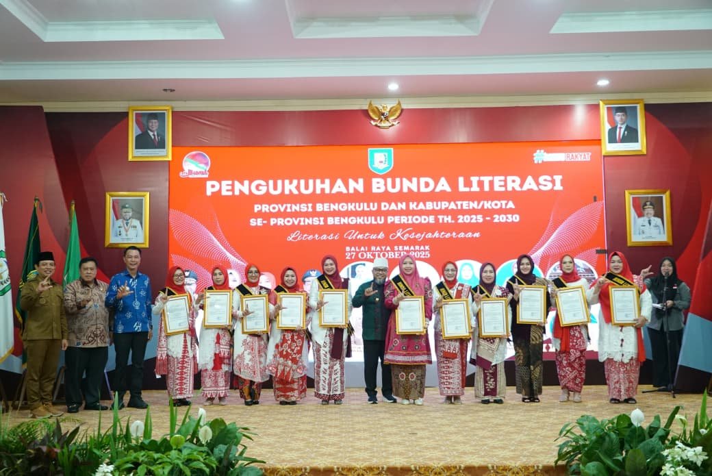 BENGKULU, infosumatera.com-Pemerintah Provinsi Bengkulu dipimpin Gubernur Bengkulu Helmi Hasan mengukuhkan Bunda Literasi Provinsi Bengkulu serta Bunda Literasi dari seluruh kabupaten/kota periode 2025–2030 di Balai Raya Semarak Bengkulu, Senin 27 Oktober 2025.