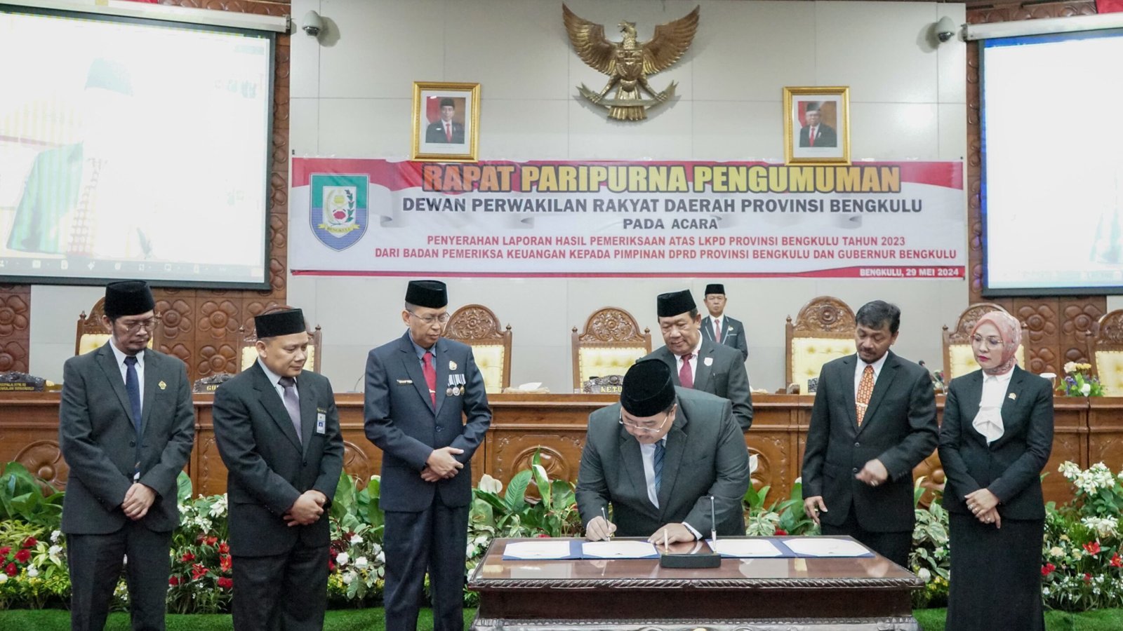 “Berdasarkan hasil pemeriksaan Badan Pemeriksa Keuangan (BPK) termasuk implementasi rencana aksi yang dilaksanakan Pemerintah Provinsi Bengkulu, maka BPK memberikan opini Wajar Tanpa Pengecualian (WTP) atas Laporan Keuangan Pemerintah Daerah (LKPD) pemerintah Provinsi Bengkulu tahun 2023,” sampai Auditor Utama  Keuangan Negara V  BPK RI Slamet Kurniawan, saat menyarahkan LHP BPK RI kepada Gubernur Bengkulu dan Ketua DPRD Provinsi Bengkulu,