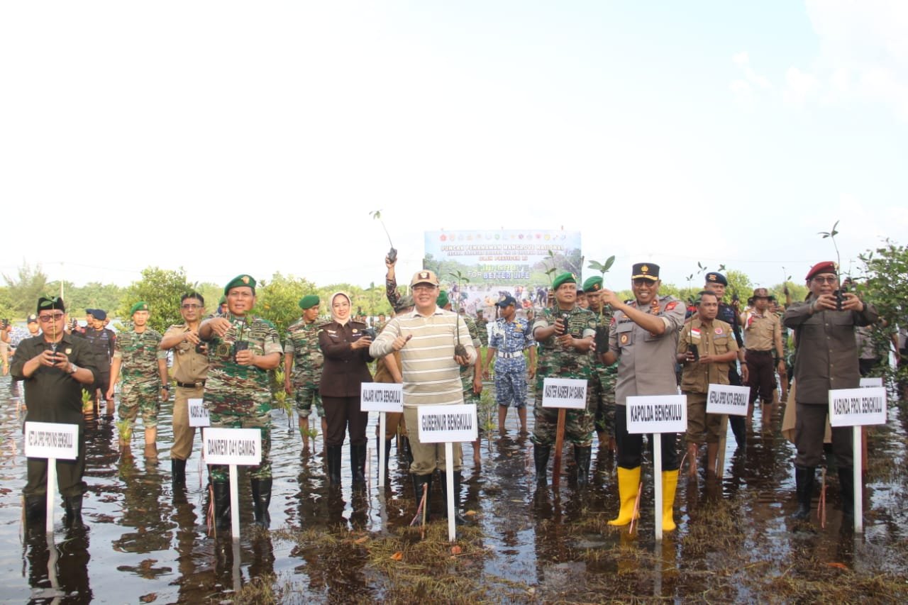 infosumatera.com- Wujud nyata menjaga dan melestarikan ekosistem hutan mangrove di pesisir pantai Bengkulu, Gubernur Bengkulu Rohidin Mersyah dan jajaran TNI/Polri, Forkopimda bersama masyarakar melakukan penanaman 1000 bibit mangrove.