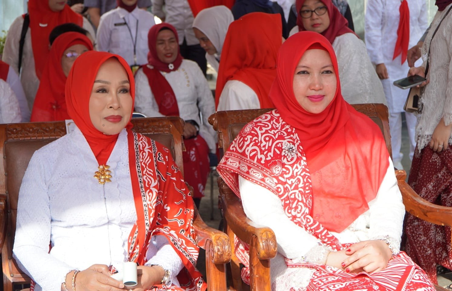 Upacara berlangsung khidmat dengan peserta yang tampil anggun mengenakan kebaya bernuansa merah putih.